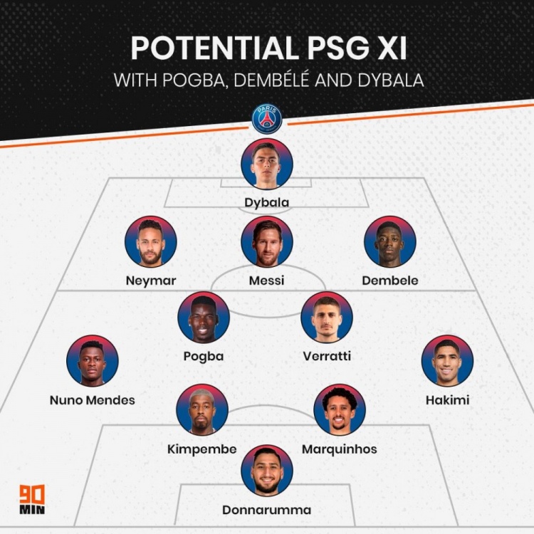 3月28日讯 媒体90min对于巴黎圣日耳曼新赛季的阵容进行了预测,他们表示球队可能在今夏迎来迪巴拉、登贝莱、博格巴三名新援。